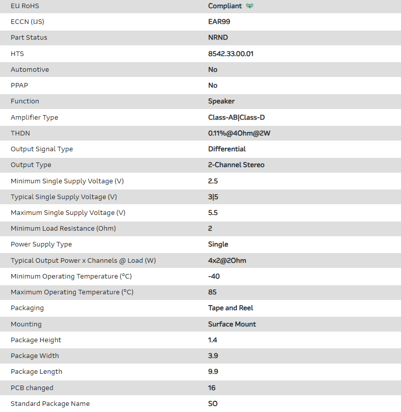 Audio Amp Speaker 2-CH Stereo 4W Class-AB/Class-D 16-Pin SOP EP T/R