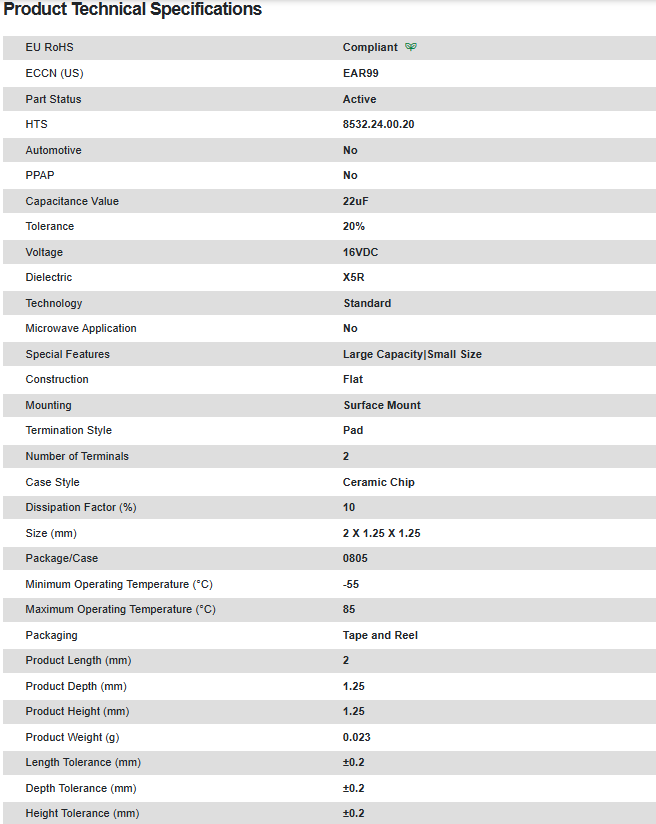 贴片电容(MLCC)Cap Ceramic 22uF 16V X5R 20% Pad SMD 0805 85°C T/R