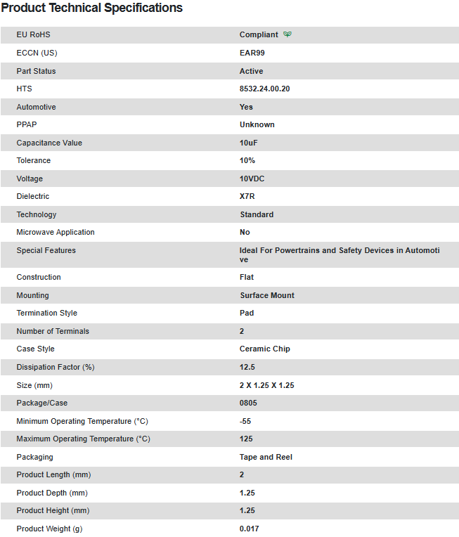 贴片电容(MLCC)Cap Ceramic 10uF 10V X7R 10% Pad SMD 0805 125°C Automotive T/R