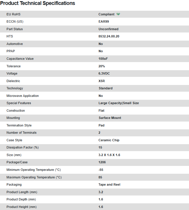 贴片电容(MLCC)Cap Ceramic 100uF 6.3V X5R 20% Pad SMD 1206 85°C T/R