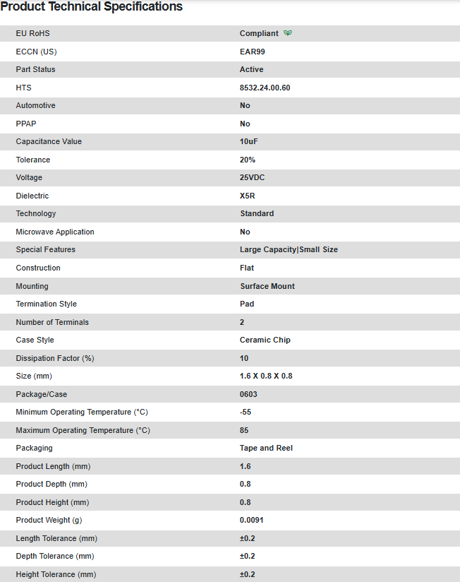 贴片电容(MLCC)Cap Ceramic 10uF 25V X5R 20% Pad SMD 0603 85°C T/R