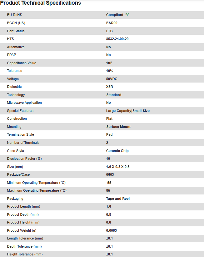 贴片电容(MLCC)Cap Ceramic 1uF 50V X5R 10% Pad SMD 0603 85°C T/R