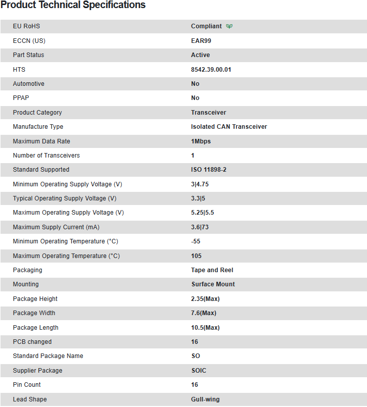 接口(驱动器/接收器/收发器) CAN 1Mbps 3.3V/5V 16-Pin SOIC T/R