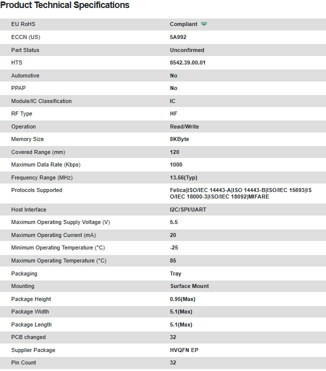 RF其它IC和模块 NFC/RFID Read/Write 13.56MHz 8KByte 32-Pin HVQFN EP Tray