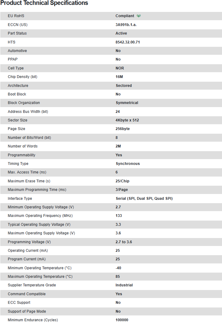 其它存储器 NOR Flash Serial (SPI, Dual SPI, Quad SPI) 3.3V 16M-bit 2M x 8 6ns 8-Pin SOIC N Tube