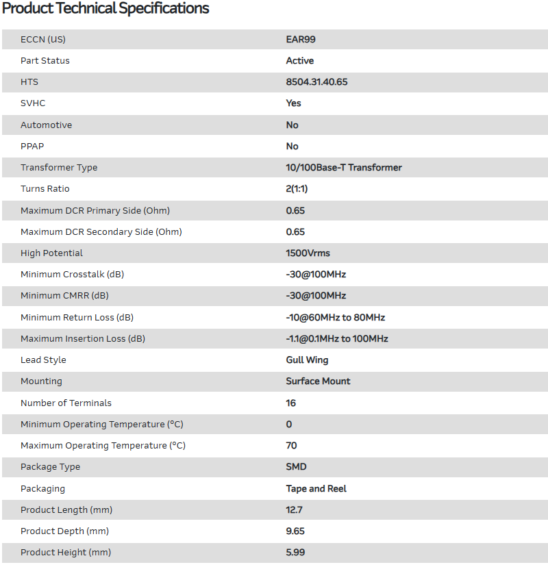 Telecom Transformer 2(1:1) 0.65Ohm Prim. DCR 0.65Ohm Sec. DCR 16 Terminal Gull Wing SMD