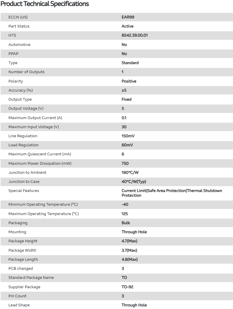 Standard Regulator Pos 5V 0.1A 3-Pin TO-92 Bulk