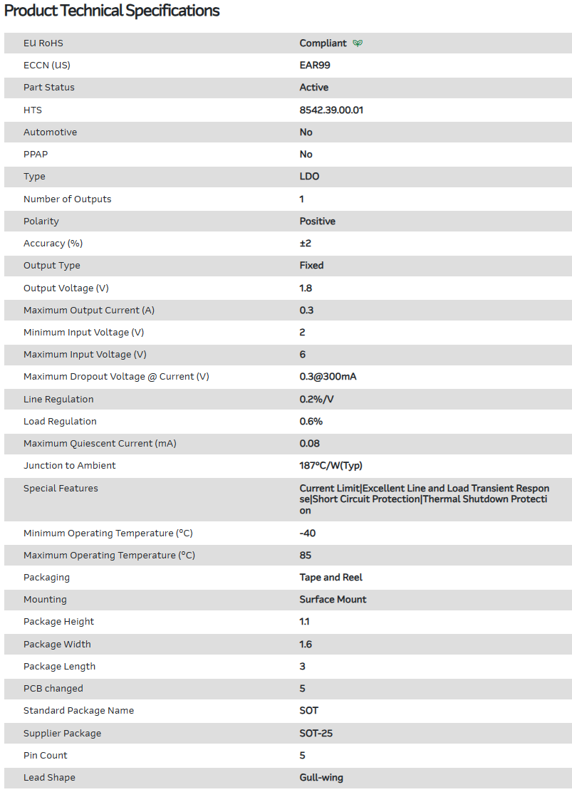 LDO Regulator Pos 1.8V 0.3A 5-Pin SOT-25 T/R