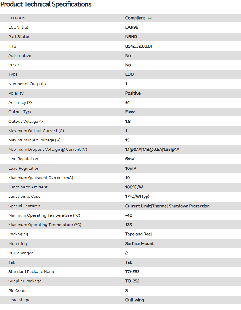 LDO Regulator Pos 1.8V 1A 3-Pin(2+Tab) TO-252 T/R