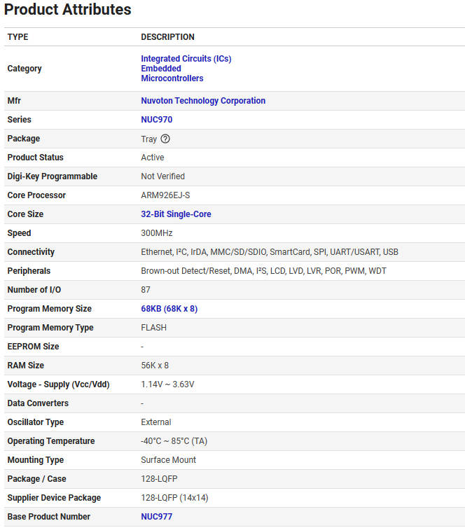 单片机 ARM926EJ-S NUC970 Microcontroller IC 32-Bit Single-Core 300MHz 68KB (68K x 8) FLASH 128-LQFP (14x14)