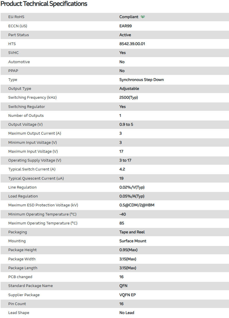 DC-DC电源芯片 Conv DC-DC 3V to 17V Synchronous Step Down Single-Out 0.9V to 5V 3A 16-Pin VQFN EP T/R