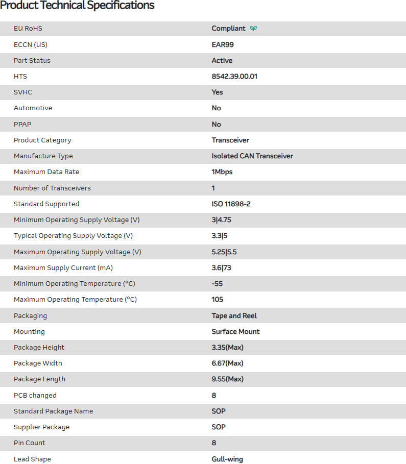 接口(驱动器/接收器/收发器)CAN 1Mbps 3.3V/5V 8-Pin SOP T/R