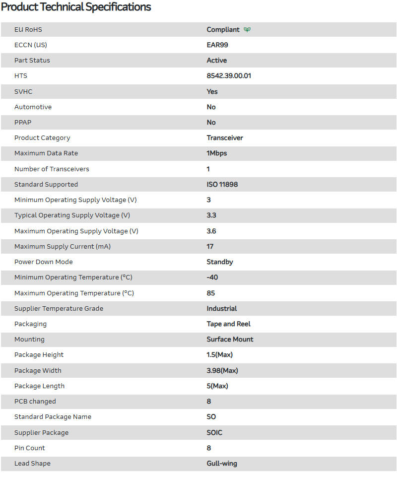 接口(驱动器/接收器/收发器)CAN 1Mbps Standby 3.3V 8-Pin SOIC T/R