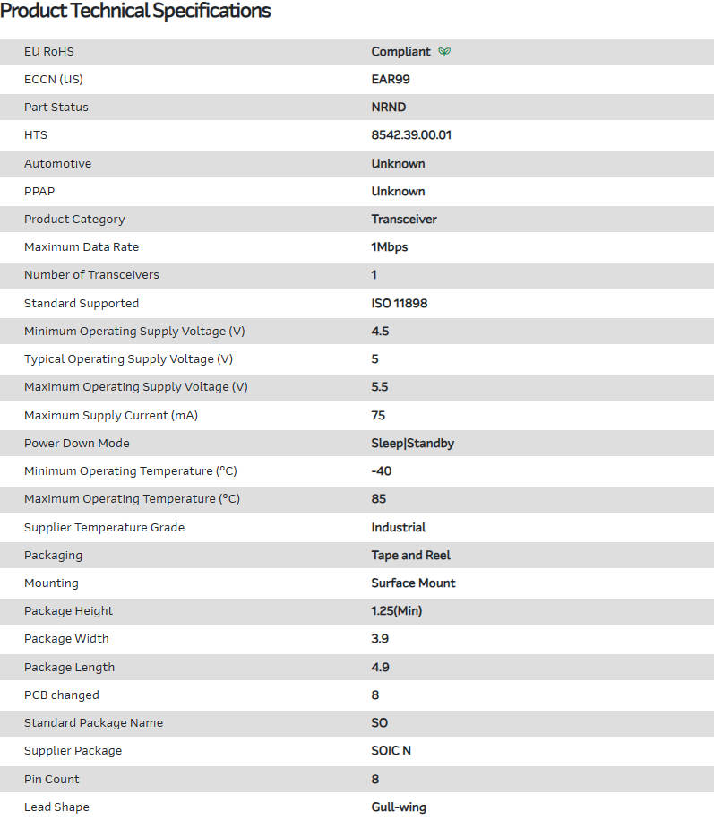 收发器 协议类别 CAN 1Mbps Sleep/Standby 5V 8-Pin SOIC N T/R