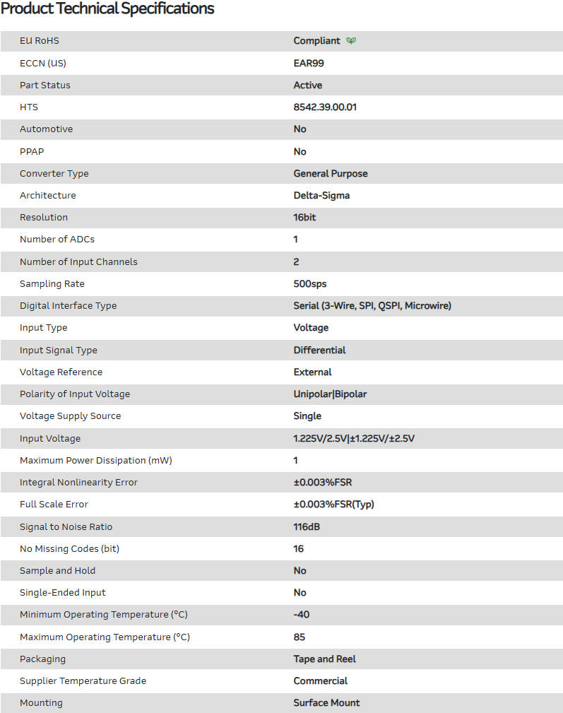 模数转换器(ADC)2-Channel Single ADC Delta-Sigma 500sps 16-bit Serial 16-Pin SOIC W T/R