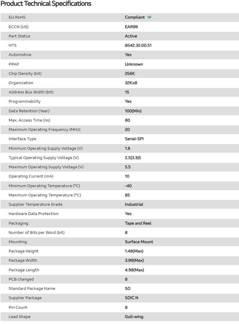 EEPROM存储器 EEPROM Serial-SPI 256K-bit 32K x 8 2.5V/3.3V/5V Automotive AEC-Q100 8-Pin SOIC N T/R