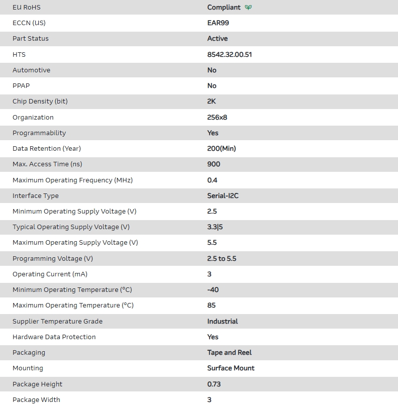 EEPROM Serial-I2C 2K-bit 256 x 8 3.3V/5V 8-Pin TDFN EP T/R