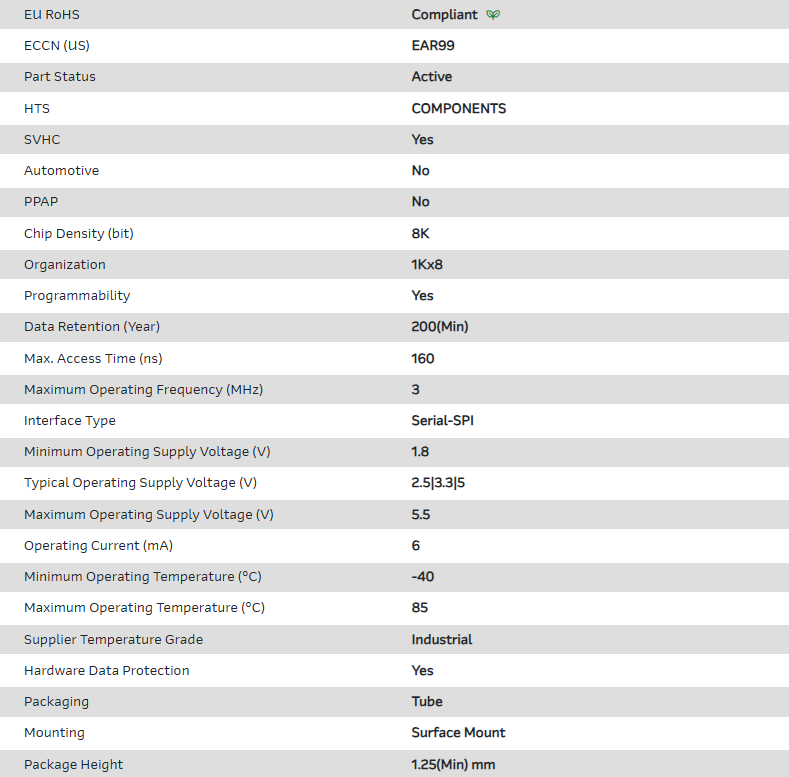 EEPROM Serial-SPI 8K-bit 1K x 8 2.5V/3.3V/5V 8-Pin SOIC N Tube