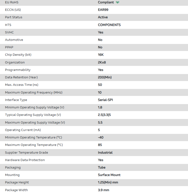 EEPROM Serial-SPI 16K-bit 2K x 8 2.5V/3.3V/5V 8-Pin SOIC N Tube