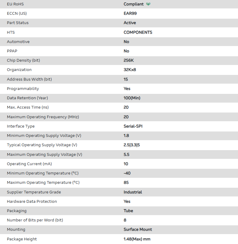 EEPROM Serial-SPI 256K-bit 32K x 8 2.5V/3.3V/5V 8-Pin SOIC N Tube
