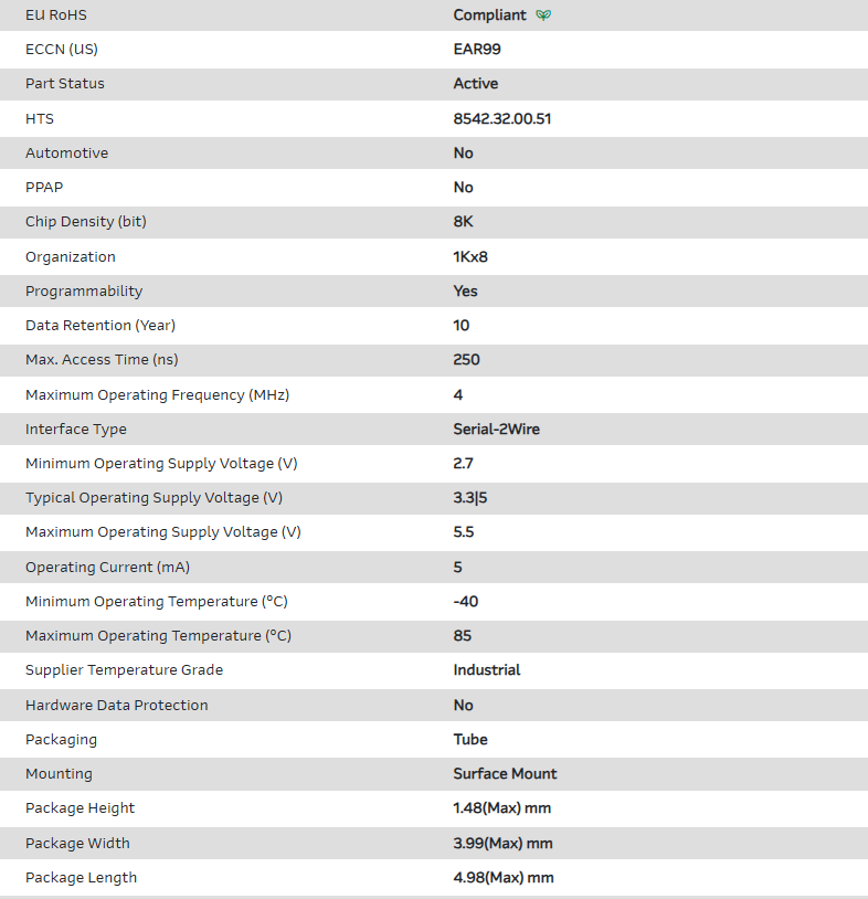 EEPROM Serial-2Wire 8K-bit 1K x 8 3.3V/5V 8-Pin SOIC W Tube