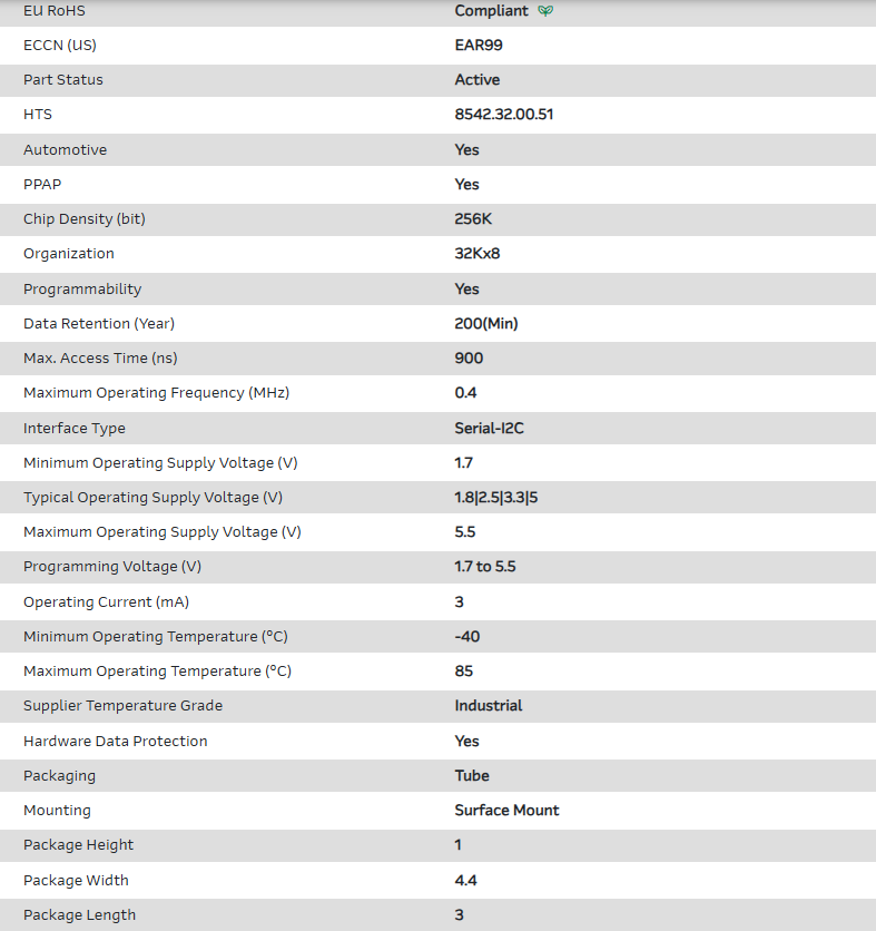 EEPROM Serial-I2C 256K-bit 32K x 8 1.8V/2.5V/3.3V/5V Automotive AEC-Q100 8-Pin TSSOP Tube
