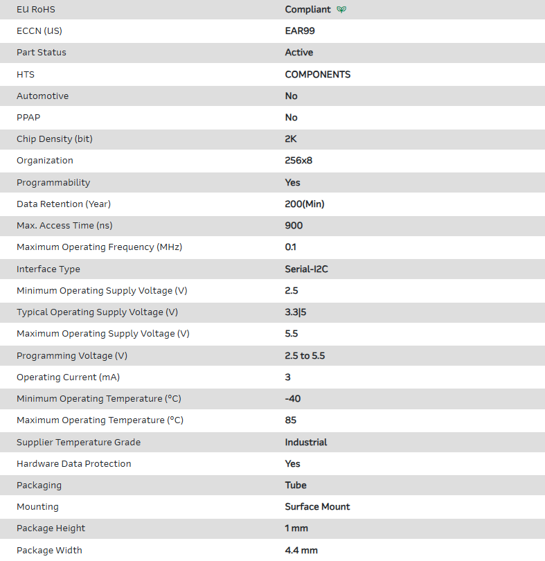 EEPROM Serial-I2C 2K-bit 256 x 8 3.3V/5V 8-Pin TSSOP Tube