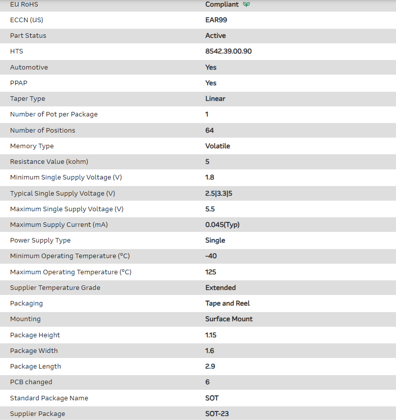 Digital Potentiometer 5kOhm 64POS Volatile Linear Automotive 6-Pin SOT-23 T/R