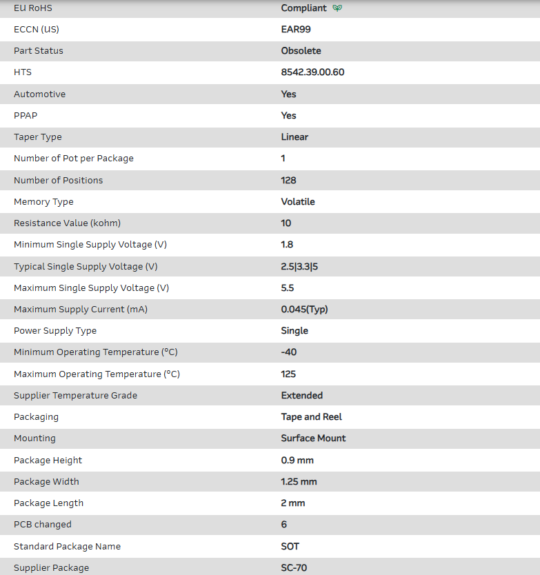 Digital Potentiometer 10kOhm 128POS Volatile Linear Automotive AEC-Q100 6-Pin SC-70 T/R