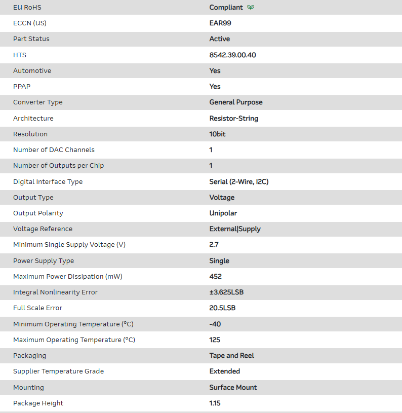 DAC 1-CH Resistor-String 10-bit 6-Pin SOT-23 T/R Automotive AEC-Q100