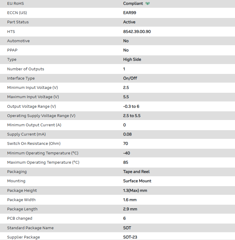 Power Switch Hi Side 1-OUT 0A 70mOhm 6-Pin SOT-23 T/R