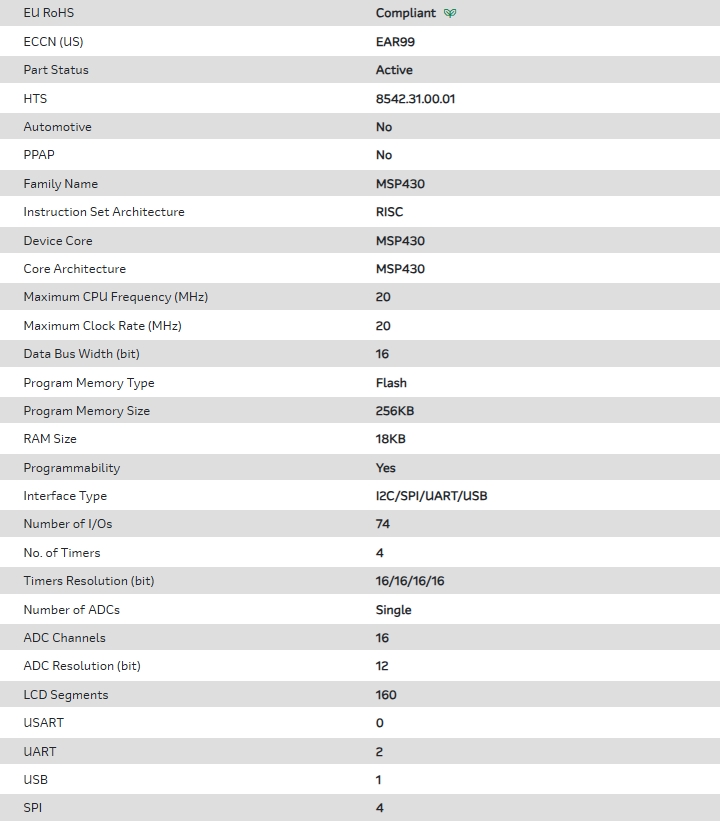 MCU 16-bit MSP430 RISC 256KB Flash 2.5V/3.3V 100-Pin LQFP T/R