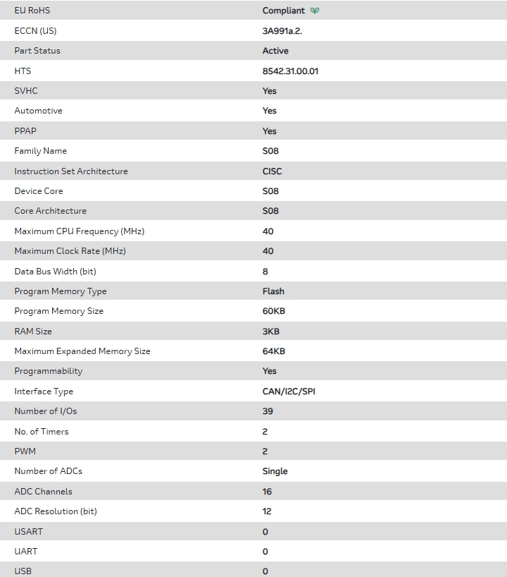 MCU 8-bit S08 CISC 60KB Flash 3.3V/5V Automotive AEC-Q100 48-Pin LQFP Tray
