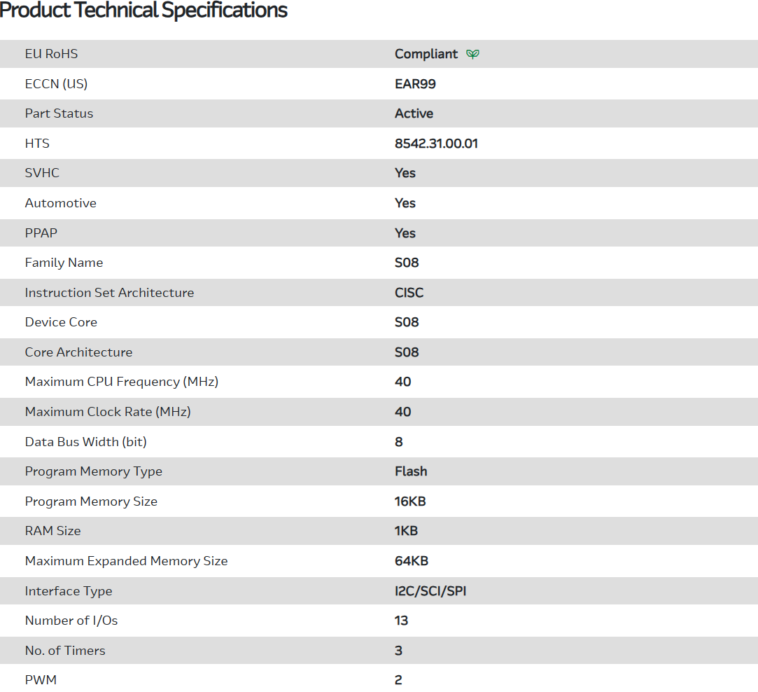 MCU 8-bit S08 CISC 16KB Flash 3.3V/5V Automotive AEC-Q100 16-Pin TSSOP Tube
