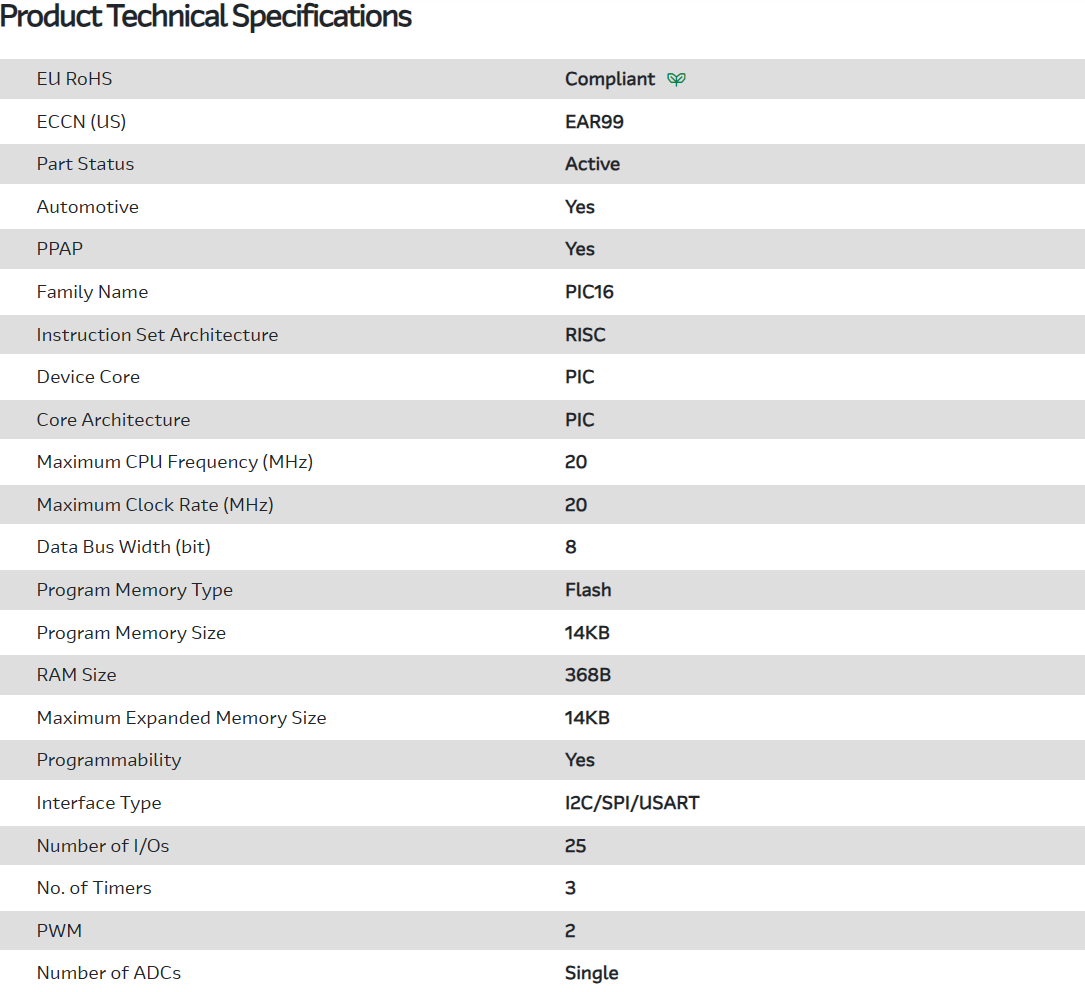 MCU 8-bit PIC RISC 14KB Flash 2.5V/3.3V/5V Automotive AEC-Q100 28-Pin UQFN EP Tube