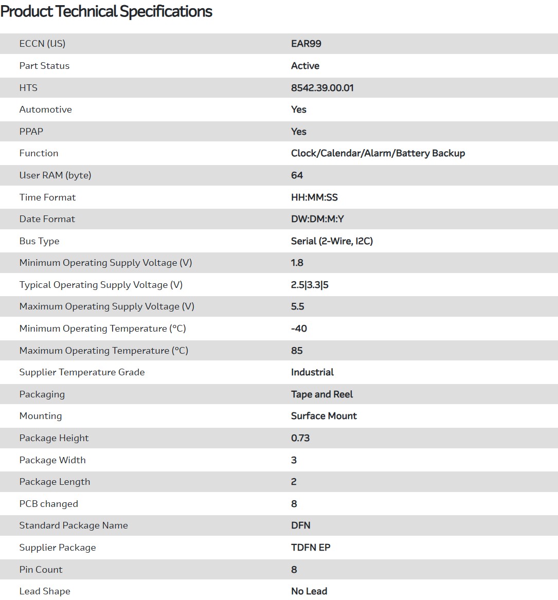 Real Time Clock Serial 64byte Clock/Calendar/Alarm/Battery Backup Automotive AEC-Q100 8-Pin TDFN EP T/R