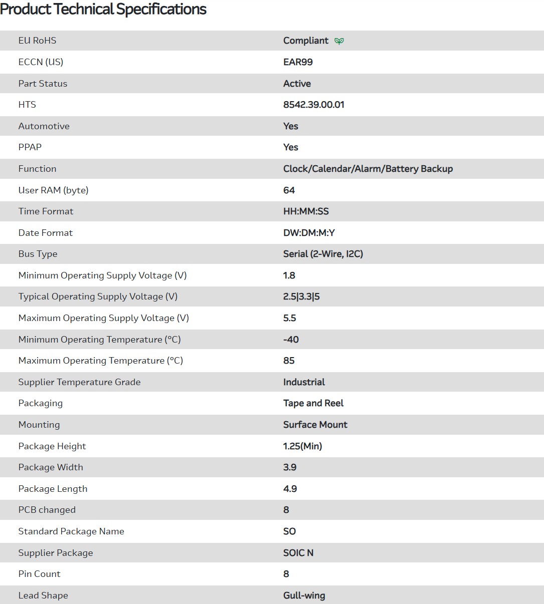 Real Time Clock Serial 64byte Clock/Calendar/Alarm/Battery Backup Automotive AEC-Q100 8-Pin SOIC N T/R