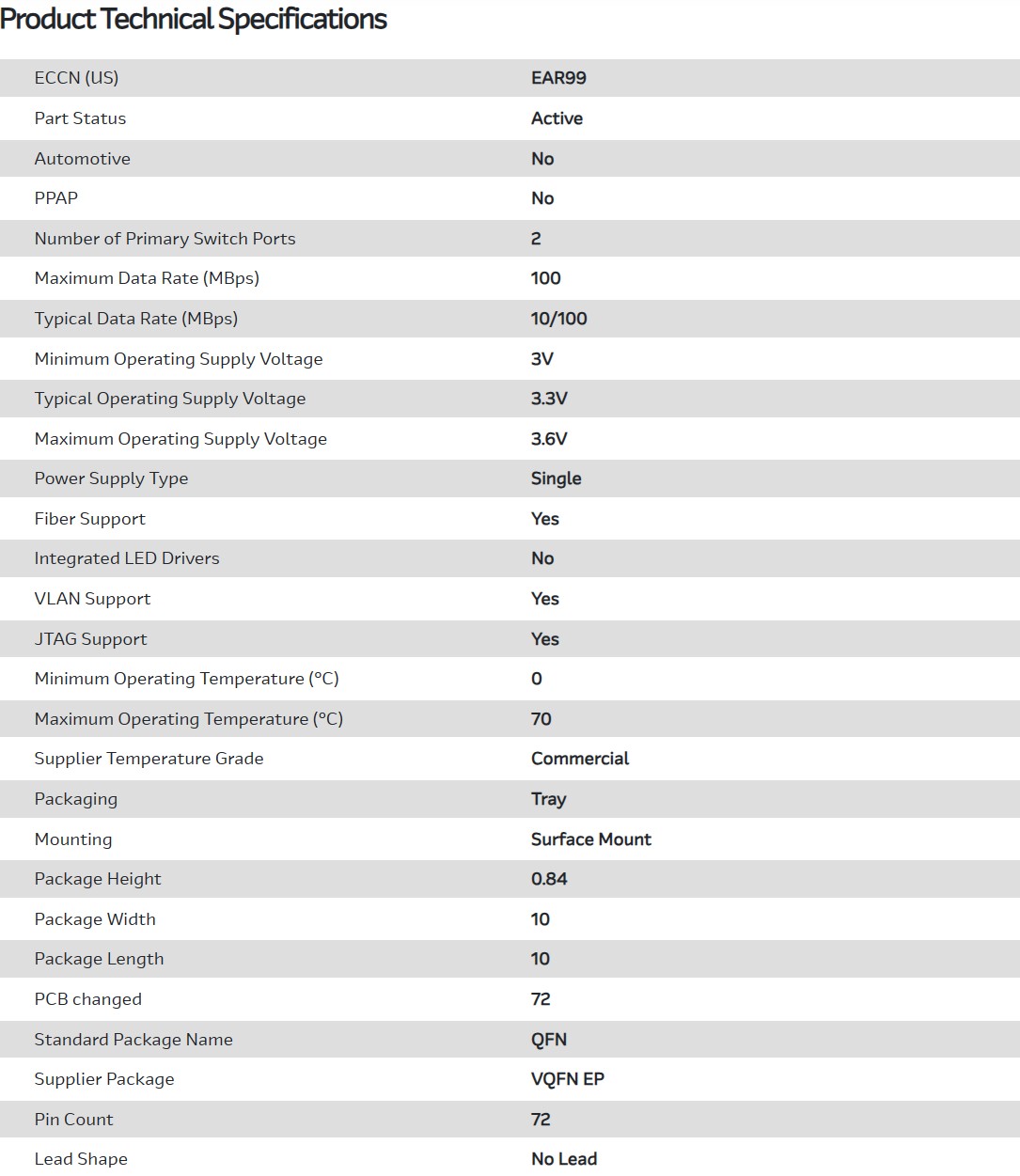 Ethernet Switch 2-Port 100Mbps 72-Pin VQFN EP Tray