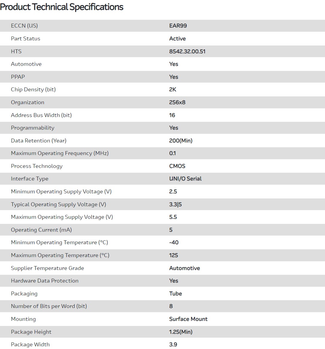 EEPROM UNI/O Serial 2K-bit 256 x 8 3.3V/5V Automotive AEC-Q100 8-Pin SOIC N Tube