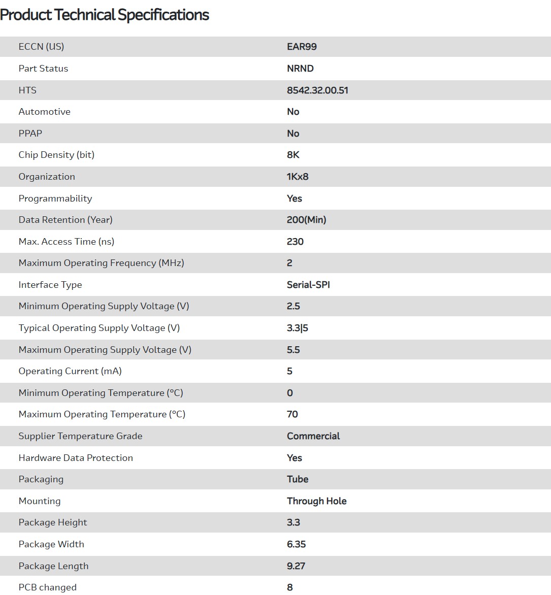 EEPROM Serial-SPI 8K-bit 1K x 8 3.3V/5V 8-Pin PDIP Tube