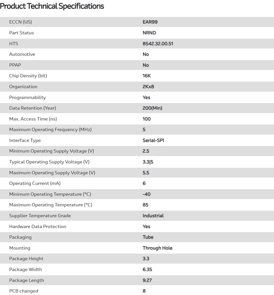EEPROM Serial-SPI 8K-bit 1K x 8 3.3V/5V 8-Pin PDIP Tube