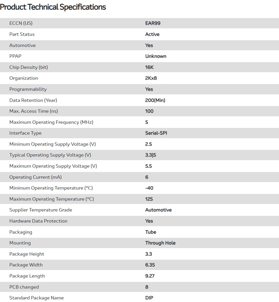 EEPROM Serial-SPI 16K-bit 2K x 8 3.3V/5V Automotive AEC-Q100 8-Pin PDIP Tube