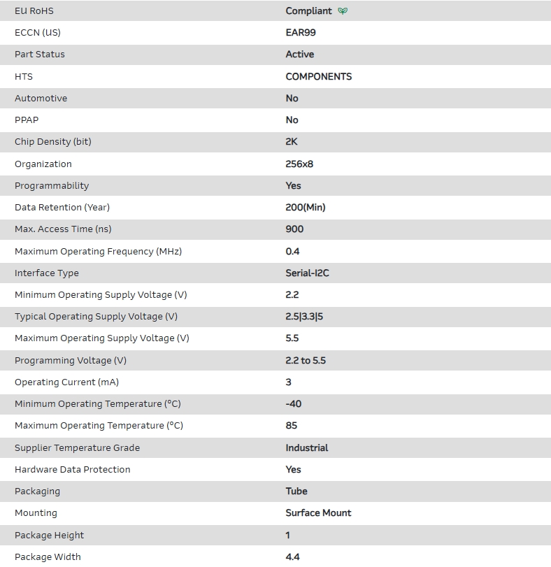 EEPROM Serial-I2C 2K-bit 256 x 8 2.5V/3.3V/5V 8-Pin TSSOP Tube