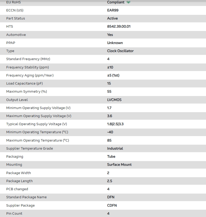 Oscillator MEMS 4MHz ±10ppm (Stability) 15pF LVCMOS 55% 1.8V/2.5V/3.3V Automotive AEC-Q100 4-Pin CDFN SMD Tube