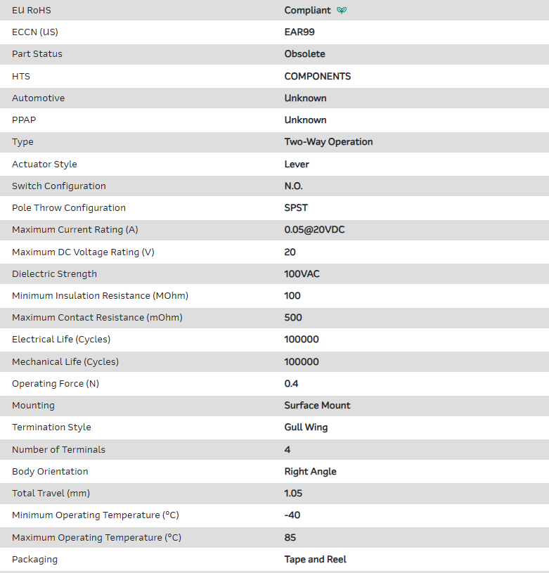 Switch Detector N.O. SPST Lever Gull Wing 0.05A 20VDC SMD T/R