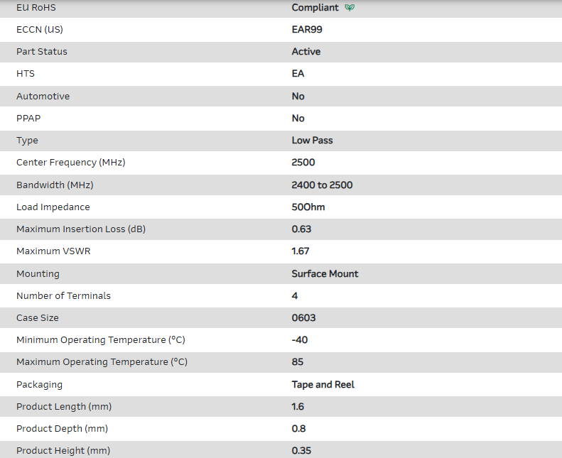 RF Filter Low Pass 2500MHz 2400MHz to 2500MHz 0.63dB 50Ohm SMD 4Pin 0603 T/R