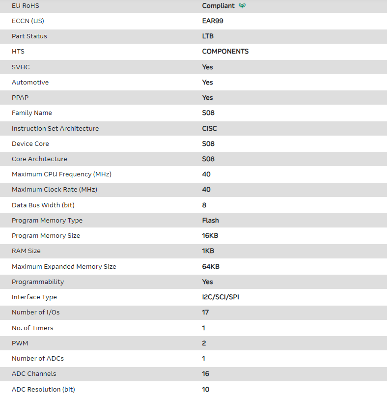 MCU 8-bit S08 CISC 16KB Flash 3.3V/5V Automotive AEC-Q100 20-Pin TSSOP T/R
