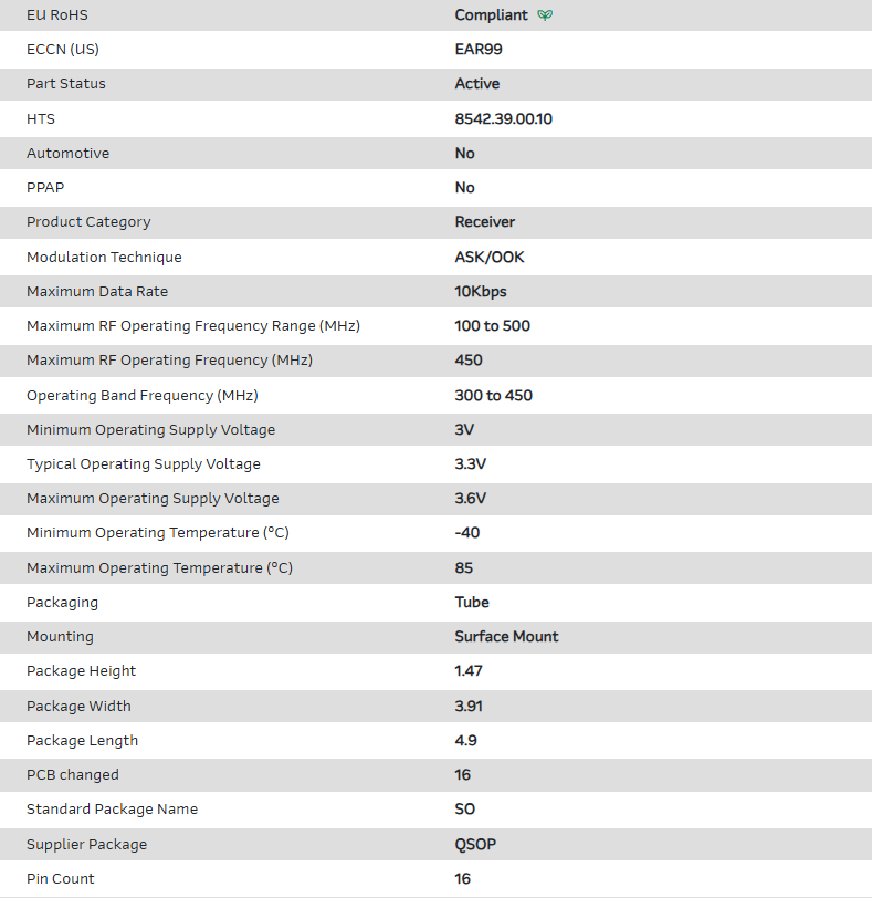 RF Receiver ASK/OOK 3.3V 16-Pin QSOP Tube