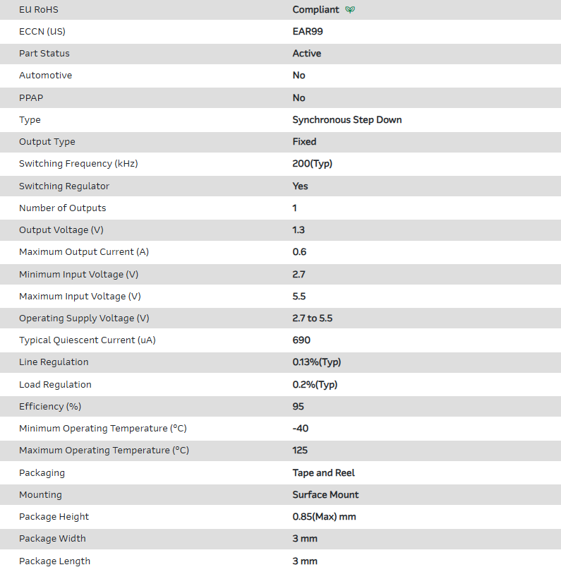 Conv DC-DC 2.7V to 5.5V Synchronous Step Down Single-Out 1.3V 0.6A 10-Pin DFN EP T/R