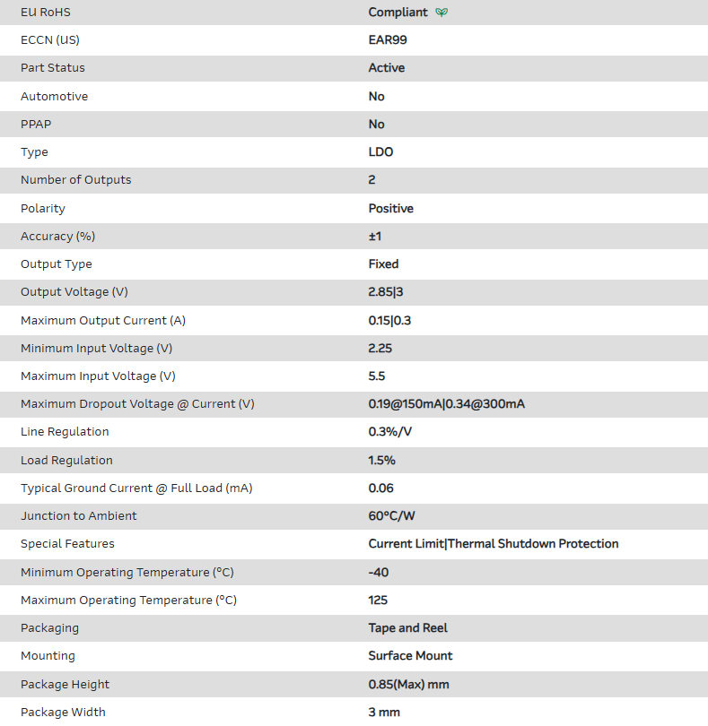 LDO Regulator Pos 2.85V3V 0.15A/0.3A 10-Pin DFN EP T/R